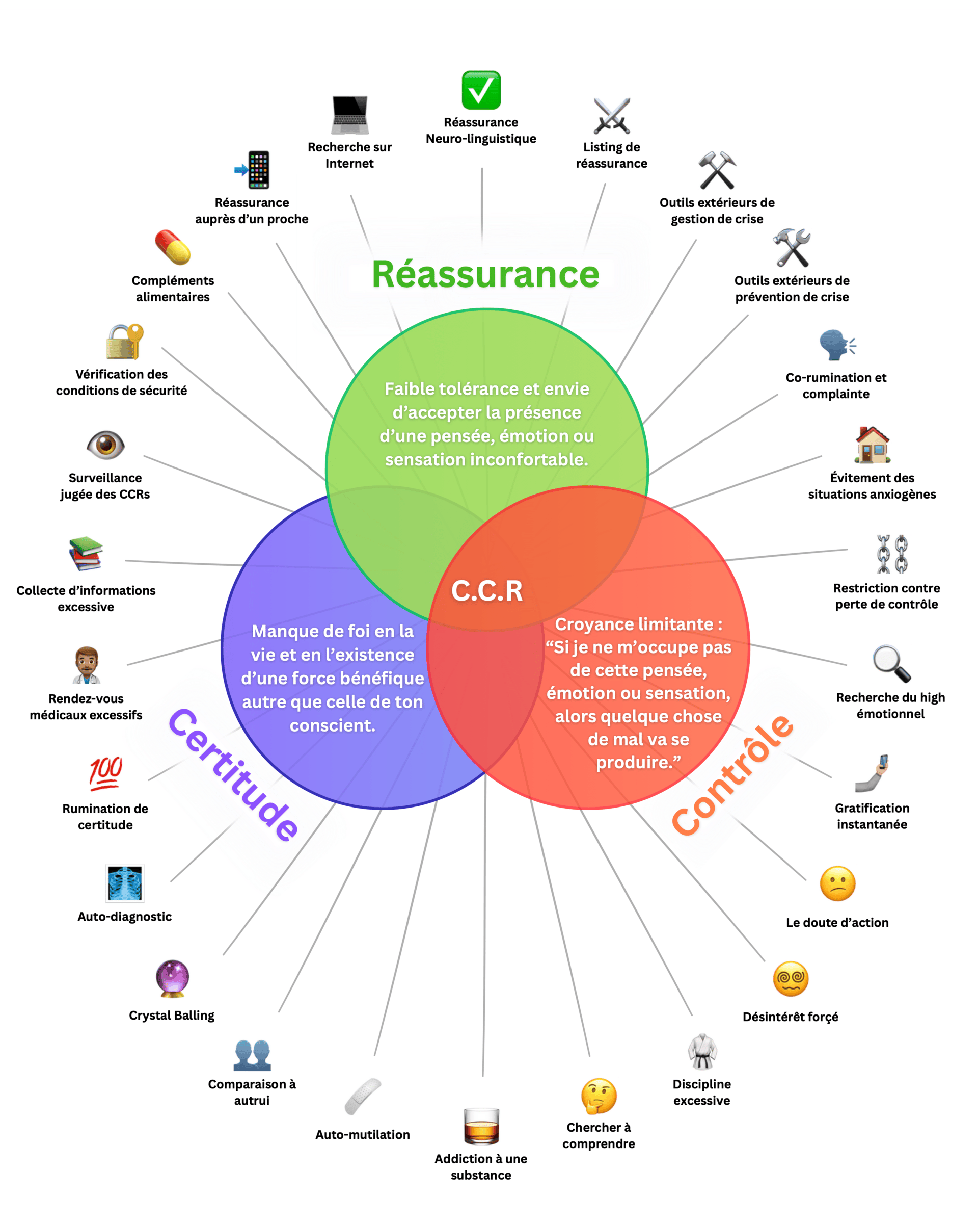 Ces comportements et habitudes à changer sont les 26 mécanismes de CCR, ils sont dans ton domaine de contrôle, et les arrêter permet d’initier la réaction en chaîne qui entraînera la dissolution de la tendance au CCR puis la celle des 3 noyaux de l’angoisse.